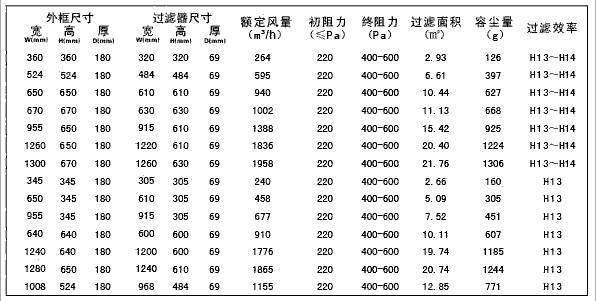可更換式一體化高效過濾器型號(hào)尺寸及其它參數(shù):