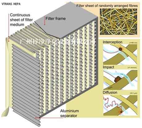 高效過濾器結(jié)構(gòu)采用超細(xì)玻璃纖維紙作濾料,膠板紙、鋁膜等材料作分隔板,與鋁框、鍍鋅鐵框等膠 合而成。具有過濾效率高,阻力低,容塵量大等特點。