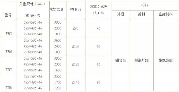 FB板式中效過濾器型號(hào)尺寸及其它參數(shù):