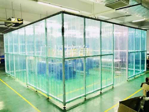 材料以鋼方通噴塑作為框架,采用風(fēng)機(jī)濾網(wǎng)機(jī)組FFU送風(fēng),千級凈化棚四周圍用防靜電垂簾,頂部鋪蓋密縫盲板,形成一個密縫區(qū),內(nèi)部凈化級別可達(dá)10—100000級;特別適用于車間內(nèi)局部凈化級別要求高的區(qū)域,如流水線作業(yè)區(qū)域。高精確度產(chǎn)品組裝區(qū)。